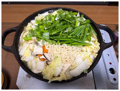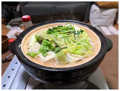これまでは鉄鍋でしたが、土鍋が登場。やはり深い方が麺類を入れるには都合がいい。豆腐と野菜がたっぷりで、航空祭で北風に吹かれた身体が温まりました。妻よありがとう。