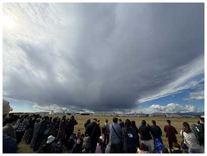 昨年と同じく開門時刻に合わせて狭山市駅から狭山市役所門ゲートに向かったのですが、今年は混雑緩和を狙って大々的に宣伝されたこともあってか、多くの人が列をなして基地に向かっていて驚きました。今年は東側に「ランウェイビューエリア」が新たに設けられ、誘導路上から展示飛行を見ることができるらしい。我々も南北に延びるエリアの中央付近に段取りスタンバイ。向かいのメイン会場側にはブルーインパルスの機体が並んでいるのが見えました。