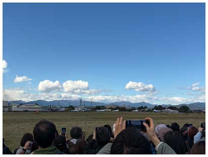 例年だとブルーインパルスの飛行は午後でしたが、今年は午前中に設定されていたのが目新しい。ところがちょうどこの時間に基地上空(だけ)は雲に覆われてきました。大丈夫か?
