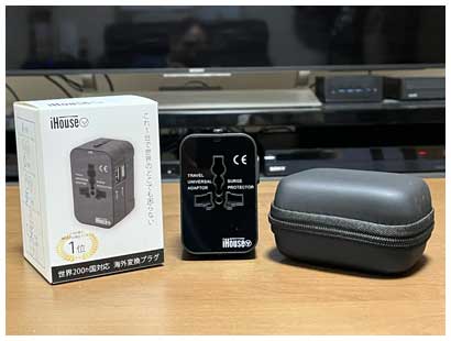 そこで見つけたのがiHouseという会社の海外変換プラグ。大きな特徴はコンセント形状の変換機能に加え、2つのUSB-Aポートを装備していること。これなら例えばパソコンのACアダプターをつないだ上に、スマホやヘッドセットを同時に充電できます。ただし電圧変換機能はないので、迂闊に日本国内向けの機器をつなぐと吹っ飛んでしまいます(昔、炊飯器を瞬殺した経験あり)。