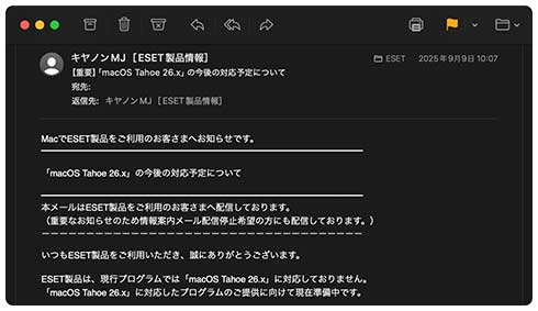 利用しているセキュリティソフトの代理店からメールが着信しました。近日公開される見込みである「macOS Tahoe 26」 への注意点です。現行バージョンはまだTahoeに対応していないため、インストールを見送るよう勧めています。なお、対応版は準備中とのこと。