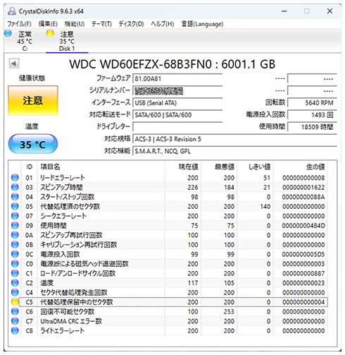 NAS上のステータスでは「正常」と表示されていましたが、念のためクレードルでWindowsマシンにつなぎ、「CrystalDiskInfo」でS.M.A.R.T.情報を確認しました。すると...。