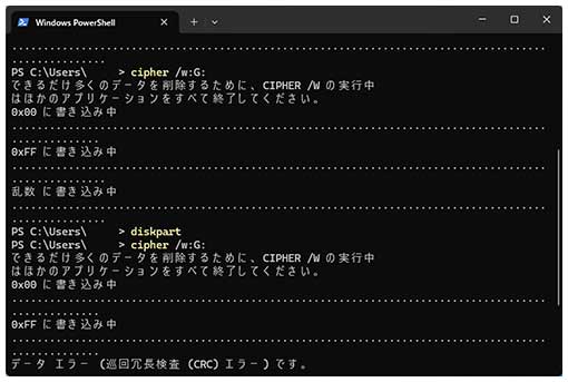 廃棄するHDDのデータ消去を進めています。Windowsマシンにつなぎ、cipherコマンドで3回データを書き込んで元のデータを復旧不能にするもの。時間はかかりますが(6TBで33時間)、費用がかからないのでのんびりやってます。