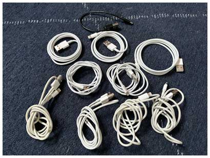 机の中を整理していて出てきたのが下のケーブル群、しかも半分は新品です。何かというとUSB-A〜Lightningケーブル。Apple製品で長らく使われてきた種類ですね。