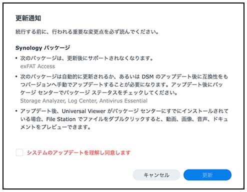 バックアップサーバーで適用しようとしたところ、下記の警告が出ました。今回のアップデートでは互換性問題を含んでおり、特に「exFAT Aceess」のサポート廃止は影響があります。exFATでフォーマットしたUSB経由の外付けHDDのデータを直接読み書きする際に困ります。