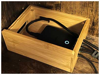 これまでと同様に、リビングの角に置いてあるラックに置くことにしました。iPhoneやiPadを並べて充電できる竹製のスタンドの中に設置。一つ計算外だったのは、側方にあるポートからケーブルを出そうとするとかなりきつく線を曲げることになったので、断線の懸念からUSB-Aポートの使用は諦めました。
