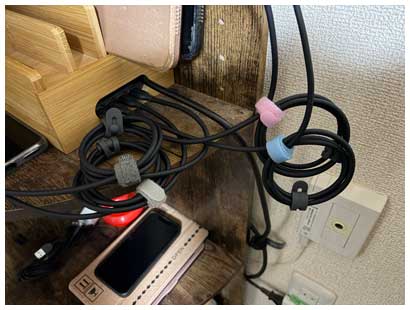 ただ、一つ失策ったのは4本あるケーブルを同じ仕様にしたこと。これだと接続先のポートの判別がつかず、どのポートが充電が早いかがわかりにくい。せめて色を変えておけば良かったのですが、もう後の祭り。そこで最大出力が得られる100W対応のポートにつながるケーブル以外はタイでまとめておくことで、最速で充電できるケーブルがわかるようにしておきました。