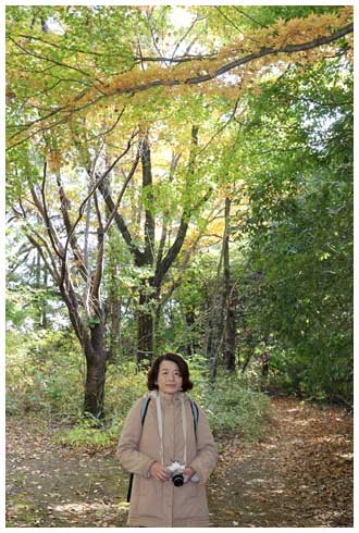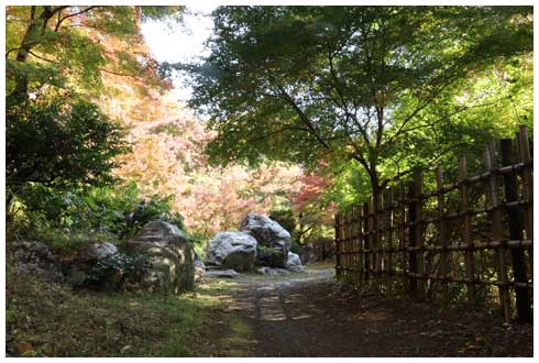 そこから林の中を抜けて日本庭園の方に出ようとしましたが、実はこの裏道にはカエデが多く植わっていて、緑色から赤色まで様々な色が存在。陽射しがスポットライトのようになって、印象的な写真が撮れました。