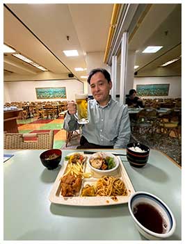 昼食をとらなかったことから、夕食へはレストランのオープンに合わせて行きました。バイキング形式で、ローストビーフや揚げたて天ぷらの提供もあり、値段の割には充分満足できる内容。ただし生ビールは相当に高かった...。