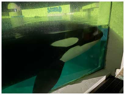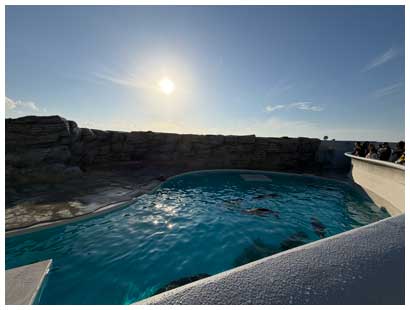 次はオーシャンスタジアム、シャチです。シャチはこの環境ではプール内の水の流れ(反時計回りに流れがある)に身を任せ、浮遊して眠っているそうです。