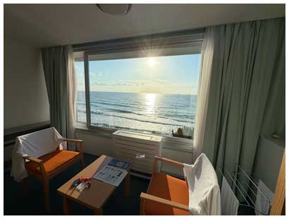 ここで一旦閉園時間を迎えたため、ホテル側出口より退場しました。チェックイン手続きを行い部屋へ。このホテルは全室オーシャンビュー、眼前には太平洋が広がっていました。設備は開業から55年が経過したというだけあり、まさに昭和レトロ。我々にとっては懐かしい雰囲気です。昔は家族で行く宿泊施設はどこもこんな感じでしたね。