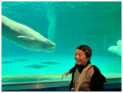 ベルーガの水槽前にて。明日のパフォーマンスが楽しみです。