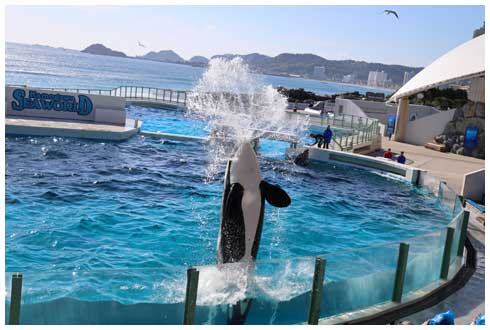オーシャンスタジアムでは再びシャチと再会。刺激すると「遊んでくれる」と勘違いして水を掛けてくるので要注意だそうです。