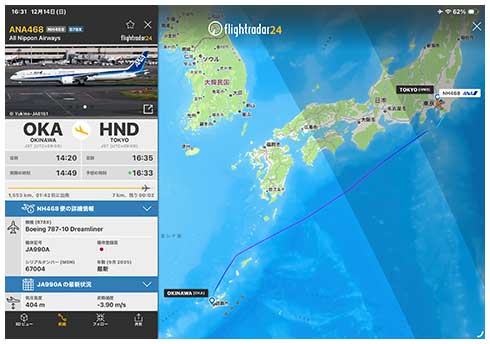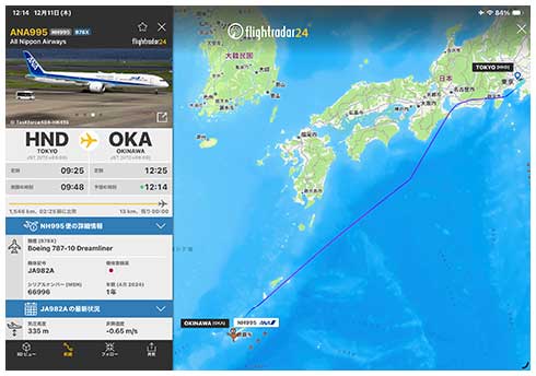 嬉しいのは接客設備が最新鋭で、シートモニターで機外カメラやコクピット目線での飛行状態などが見られます。沖縄便だと飛行時間がそこそこあるので、映画も1本見る余裕があります。