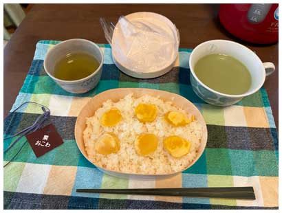 栗おこわ、北海道産アスパラのスープと一緒に頂きました。