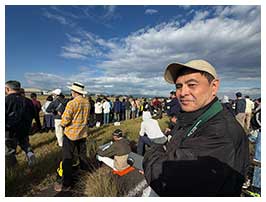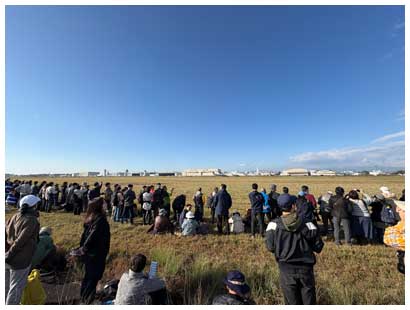 昨年と同じく開門時刻に合わせて狭山市駅から狭山市役所門ゲートに向かったのですが、今年は混雑緩和を狙って大々的に宣伝されたこともあってか、多くの人が列をなして基地に向かっていて驚きました。今年は東側に「ランウェイビューエリア」が新たに設けられ、誘導路上から展示飛行を見ることができるらしい。我々も南北に延びるエリアの中央付近に段取りスタンバイ。向かいのメイン会場側にはブルーインパルスの機体が並んでいるのが見えました。