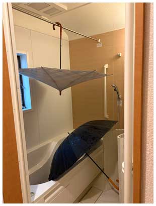 雨の日に帰宅すると、妻は必ず傘を屋内であっても干します。錆がつくと動きが渋くなったりしますからね。玄関に置くこともありますが、浴室が空いている時はそちらを使うことも。