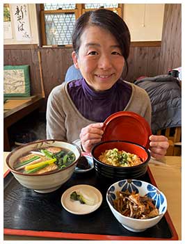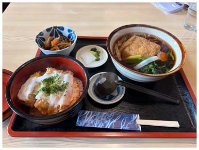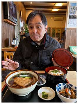 昼食は近所の蕎麦店「駒形屋」さんにしました。相変わらず開店前に行列ができる人気ぶりです。ご飯ものが食べたかったので、妻はたぬき丼セット、私はかつ丼セットを注文。温かいきつねそばと併せて頂き、ほっこりと温まりました。こちらも美味でした。