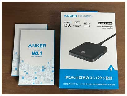 今回もAnkerの「Anker Nano Charger」を選択。USB-C×4、USB-A×2の6ポートで、トータル130Wで充電が可能。USB-Cの4ポートのうち1つは最大100Wでの充電が可能なので、ノートPCすら急速充電できる仕様です。断線しにくいケーブルも4本購入しました。