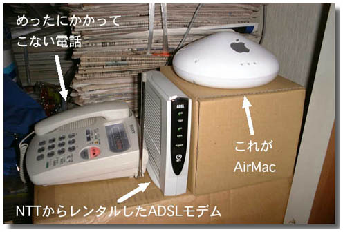 2月に申し込んだFlet's ADSL。その工事の連絡が出張直前にありました。何でも基地局までの距離は近いものの、設備の関係で8Mサービスを保証できないとのこと。本来なら噛みつくところですが、出張間のドタバタでもうかなり面倒くさくなっていたのでもういいよとばかりに投げやりOK。工事は出張から帰ってからということで4月8日に決めました。すると見事に6日にNTTからADSLモデムとスプリッターが到着。ついでにかねてから構想していたAirMac(無線LAN)を導入しました。さて、明日は問題なくつながるのかな?