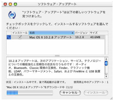 3週間の出張中に、Mac OS X 10.2.5 UpdateやQuickTime 6.1.1 Updateが配布開始されていて、久しぶりに起動したらソフトウェア・アップデートが自動的に起動し、適用するかどうかを聞かれました。Windows XPも同じくセキュリティ・アップデートがリリース。常時接続のありがたみをひしひしと感じましたね。