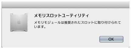 で、ここまでは良かったんですが問題が発生しました。ログイン時にメモリスロットユーティリティが毎回起動してしまうのです。「OK」ボタンを押せばダイアログは消えますが、いちいちこれを消すのも大変。インターネットで調べるとどうやらMac Proの持病なようで、OSの再インストールしか完全な解消策はないとのこと。