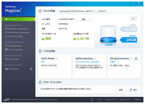 Windows 7以降のOSではTrimコマンドをサポートしており、SSDの最適化に対応しています。しかし実際にはコマンドの発行などはOS任せで、その効果ははっきり見えません。このためSSDメーカーではそれぞれ専用のメンテナンスツールを用意しているのが実情です。私の使うSSDはIntelとSamsung製で、それぞれ「SSD Toolbox」「Samsung Magician」というツールが配布されています。今回ドライブ構成を変えたのを機にそれぞれ最適化を実行しておきました。