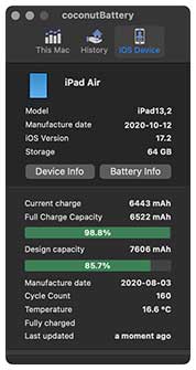 iOS機器のバックアップを取る際に、Mac用アプリ「coconutBattery」を使って各デバイスのバッテリー劣化状況を表示させてみました。