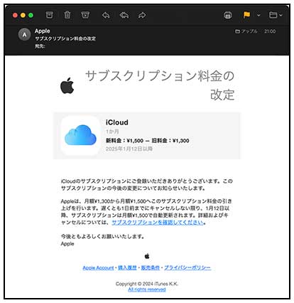 帰宅後、iPhoneの「設定」アプリにバッジがついていたので緊急アップデートかなと思ったのですが、開いてみると「iCloud+」の値上げのお知らせでした。ご丁寧にその直後にはより詳しく内容を書いたメールも着信。