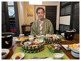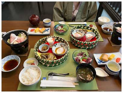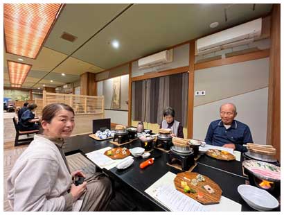 18:00から夕食でしたが、妻はやはり気持ちが悪いようで、食事はほとんど食べられず先に部屋に戻って休むことに。このため一番の楽しみだった栗ごはんが食べられない事態になってしまいました。何ということでしょう。しかしスタッフさんが気遣って下さり、彼女の分はおにぎりにして私に持たせてくれました。