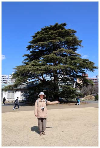 並木を通り抜けて東に進むと、中央部の原っぱに出ました。ここでは以前も写真を撮りましたが、まだ開場から間もないこともあり、人の姿が入らない巨樹の写真を撮れました。空気は少しひんやりしていましたが、それ以上に陽射しが暖かく、絶好の散歩日和です。