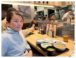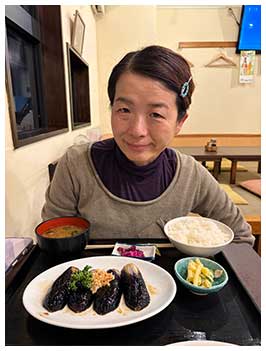 席もまだ空いていて大丈夫でした。私は「揚げギョーザオニオンぽん酢」定食、妻は「なす定食」を注文。それぞれ二切れほどおかずを取り換えっこして頂きました。ここはご飯もふっくら炊けていて美味しい。話を聞いているとちょうど我々が食べ終わる頃にご飯もなくなったようで、あれ以上到着が遅くなっていると食べられないところでした。