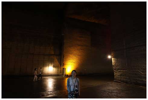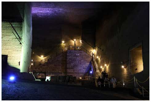 ポイント照明の中、岩の壁がそそり立つ姿は圧巻です。