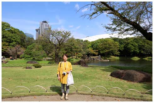 園内に入ると正面には大きな池と、その中心に島がありました。その向こうには高層ビルやドーム球場の屋根が見えるという、東京ならではの景色が広がっていました。
