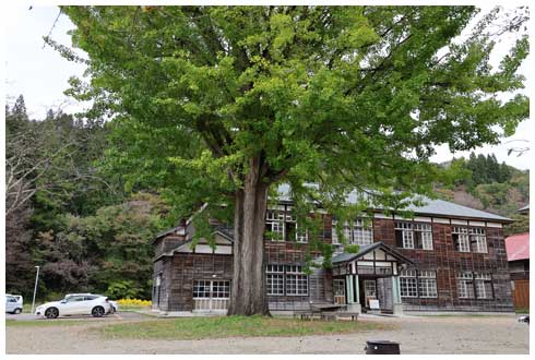 そこから少し役場方面に進んだところが旧喰丸小学校です。何度来てもこの木造校舎と校庭の大銀杏は見応えがあります。イチョウはちょうど紅葉が始まったところで、半面ほどが黄に色づいてきていました。