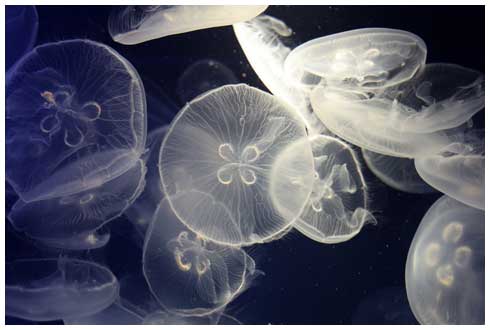 浮遊するクラゲを見ていると癒されます。縁の緑色もきれいです。