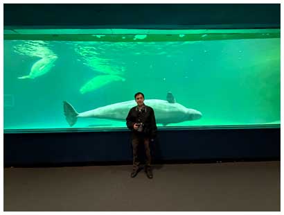 ベルーガの水槽前にて。明日のパフォーマンスが楽しみです。