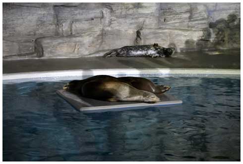 夜は水から上がって眠っていたアザラシとアシカも水の中に戻っていました。