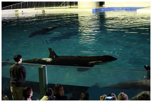 次はオーシャンスタジアム、シャチです。シャチはこの環境ではプール内の水の流れ(反時計回りに流れがある)に身を任せ、浮遊して眠っているそうです。