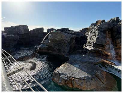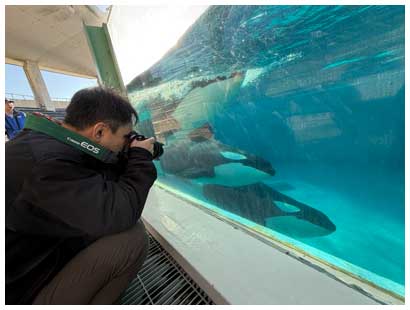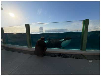 オーシャンスタジアムでは再びシャチと再会。刺激すると「遊んでくれる」と勘違いして水を掛けてくるので要注意だそうです。