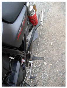 サイドスタンドの横に出ている角は、乗車時に簡単に引き出せるようについています...が、私の車は先端の丸い部分がフレームに近くて踵が上手く乗せられず、使い勝手的にはイマイチ。塗装が剥げてその傾向は一層顕著に。