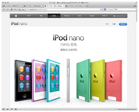 まずは旗艦である「iPod touch」、同シリーズの第5世代です。同時に発表されたiPhone 5と同じ4インチディスプレイを採用、iPhone 4Sと同じApple A5プロセッサーを搭載して処理能力を引き上げています。また、前モデルでは貧弱だったカメラ機能が向上しているのもポイントで、FaceTimeの画質向上が期待できそう。ストレージサイズは32GB/64GB。カラーバリエーションも増加しました。
